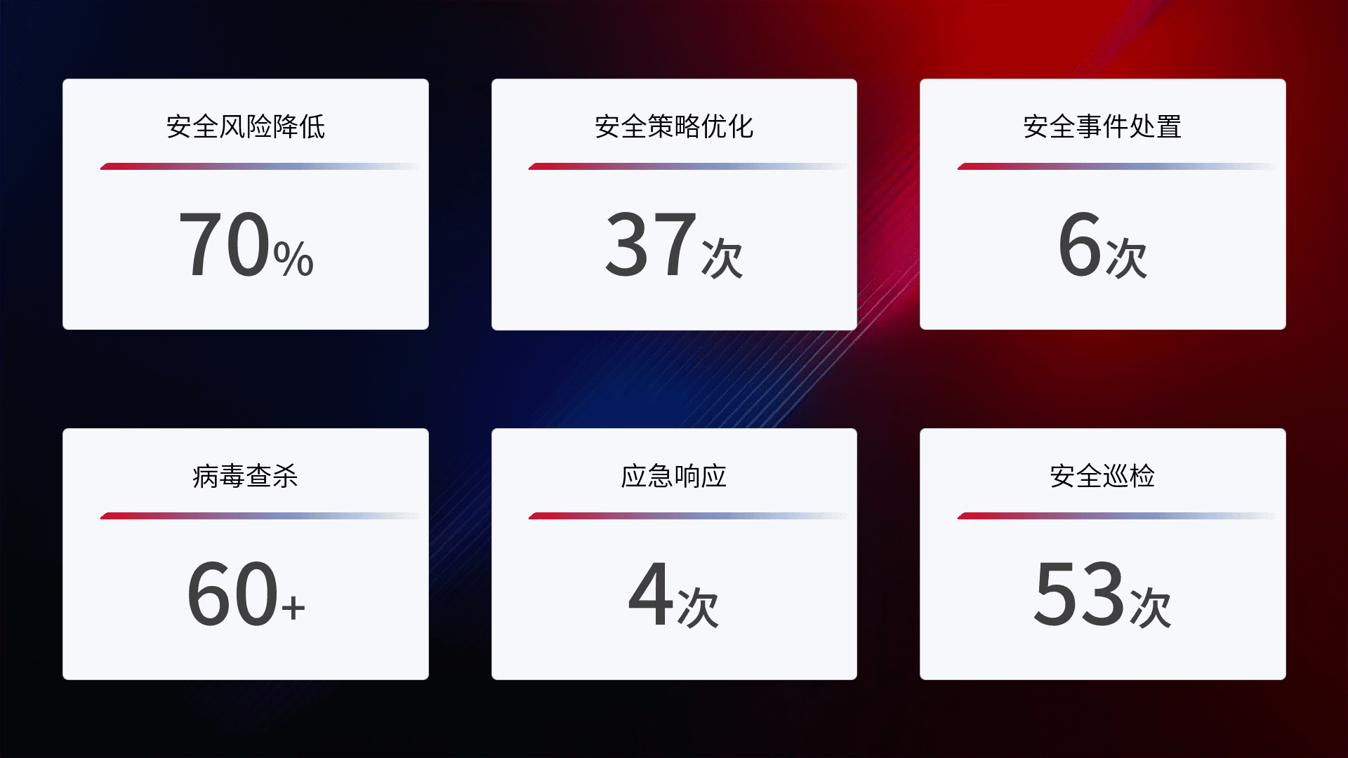 提供全面的安全事件报告体系,,包括处置报告、、、周报、、、季度和年度总结,,结合持续监控,,帮助客户深入了解网络安全状况。。。。