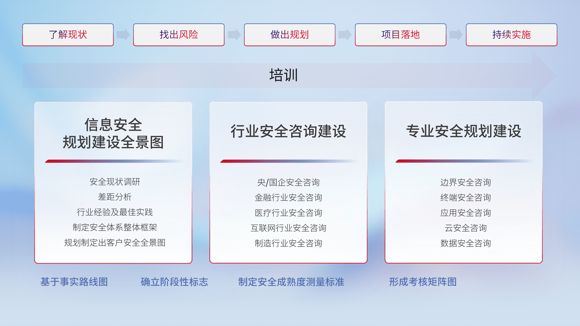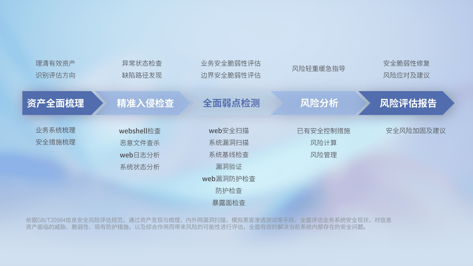 针对客户行业特性,,以专业的安全服务+多厂商联合解决方案提供专属的一站式安全管理服务,,,帮助客户全面感知网络空间威胁,,,,基于识别、、、检测、、、分析、、、、防护、、监测、、、响应的服务理论模型,,,,从方案咨询、、、、集成交付、、、评估验证、、、优化加固、、、、运维运营,,,致力于为客户提供完整的闭环管理式安全服务。。。以实战经验为客户打造高抵御风险的安全体系,,帮助客户发现威胁、、、、对抗威胁、、、、处置威胁,,,不断积累安全对抗能力,,,持续保障数字化安全。。。。